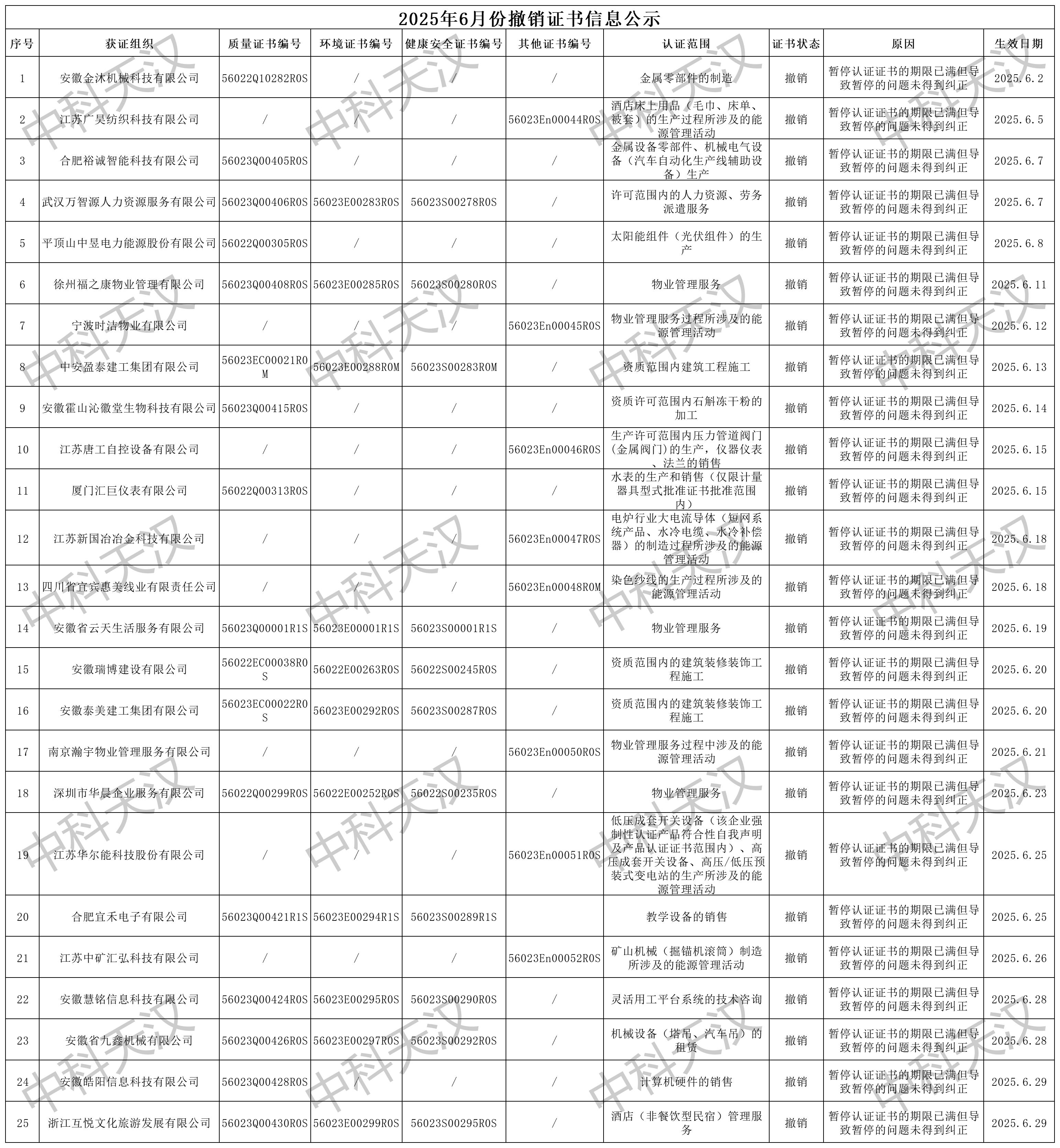2025年6月份撤銷證書信息