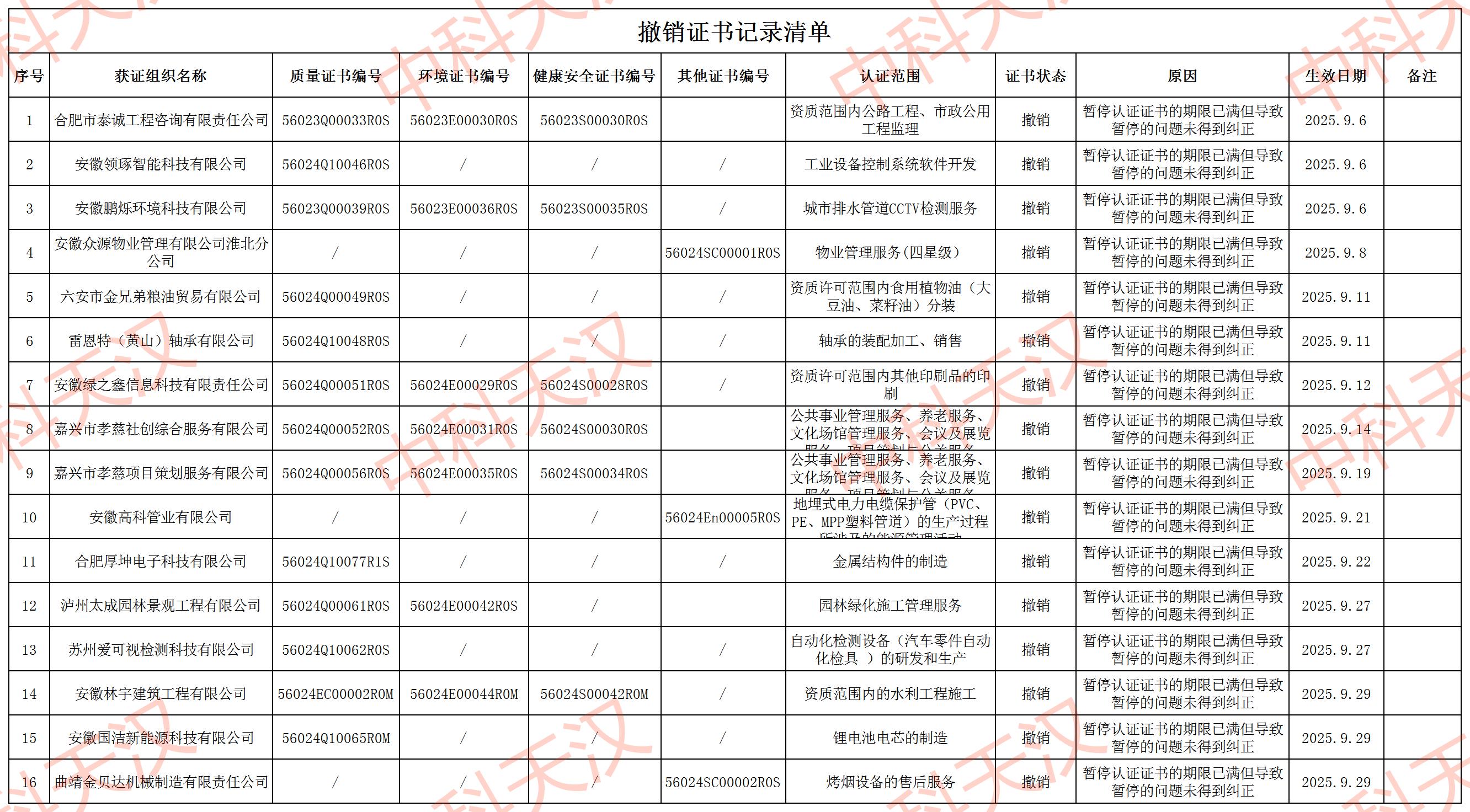 2025年9月份撤銷證書信息公示