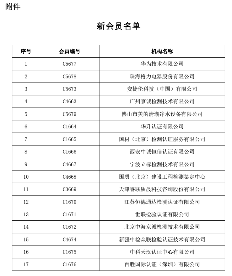 根據《中國認證認可協會章程》 第九條、 第十八條、 第十九條的規定, 經自愿申請,協會理事函審通過,華為技術有限公司、珠海格力電器股份有限公司和安捷倫科技(中國)有限公司等17家機構成為中國認證認可協會會員。